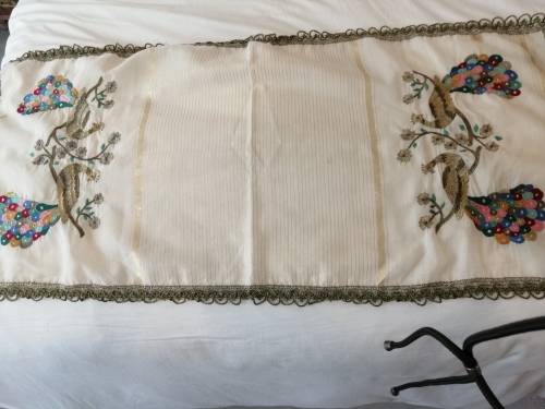 THE TABLEWARE APPEARS TO BE MADE OF ORGANZA AND MACHINE EMBROIDERED.POSSIBLY GREEK WARES.