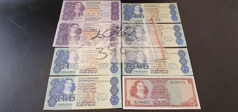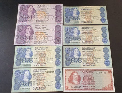 A set of 8 South African bank notes incl. 1 Rand, 5 Two rands and 2 Five rand notes