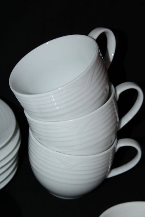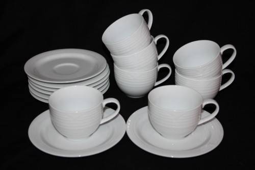 This set of Noritake "Arctic White" cups and saucers looks great and there are no chips or cracks in any of the items. The set features a minimalist design but is still striking and beautiful. The set contains 7 cups and 8 saucers. Please view the pics carefully to fully appreciate this awesome set of Noritake cups and saucers and to confirm the condition.