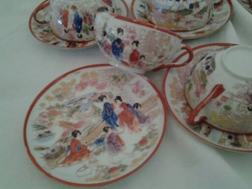 nice lot of six fine thin oriental scenes bone china tea cup duos the one cup has a fine hair line crack noted on the inside other wise in good used condition