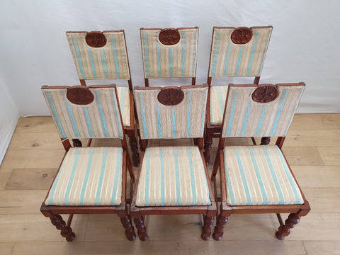 This vintage set of six carved Teak dining chairs are the ideal chairs for a smaller dining table or even as spare chairs for your existing suite. The chairs each measure 44cm x 45cm x 91cm high. The chairs are sturdy and comfortable and sit well on the ground. The upholstery is in good condition. The chairs have minor age and usage related wear. Please view the pics carefully to fully appreciate this set of dining chairs and to confirm the condition.