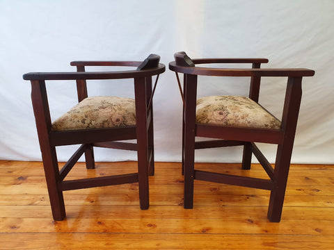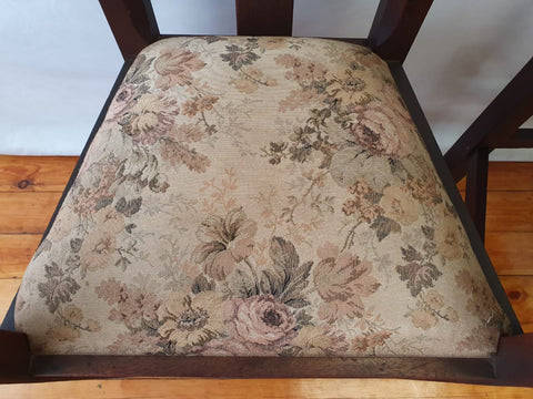 A set of two vintage oak captains armchairs with floral upholstered seats