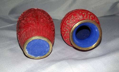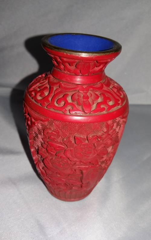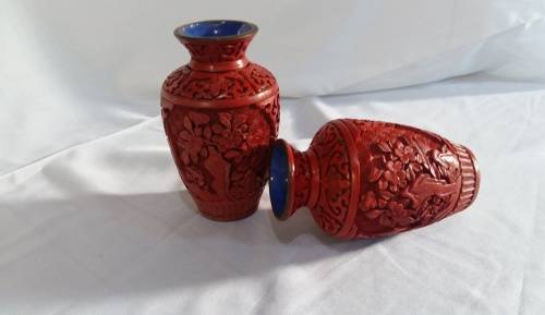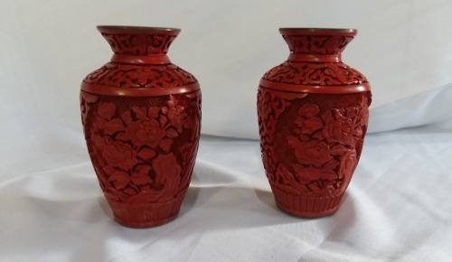 These vintage carved Cinnabar vases are carved with a floral motif that is extra charming.