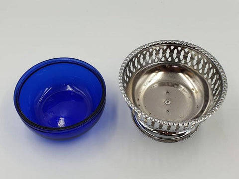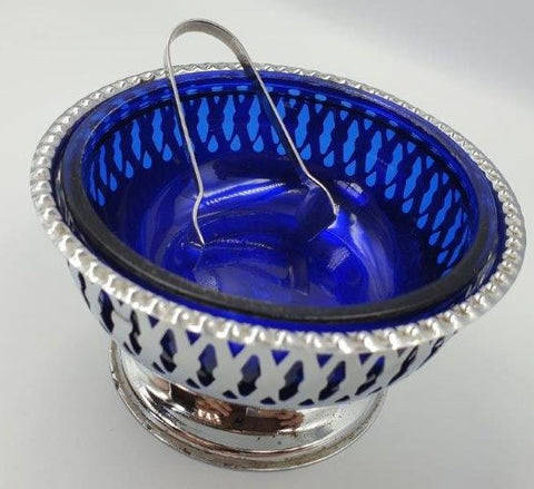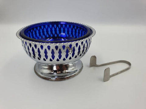 This beautiful vintage silver plated sugar bowl with an ornate design and blue glass inner is in good usable condition for its age and has normal age and usage related wear and tear and tarnish. The bowl measures 11cm across x 6cm high. This beautiful sugar bowl would make an fabulous addition to a collection of silver plated dinnerware and it would look amazing on a breakfast tray or breakfast buffet table. The bowl comes with a small set of sugar tongs marked Martin Germany, they are 6.5cm long.