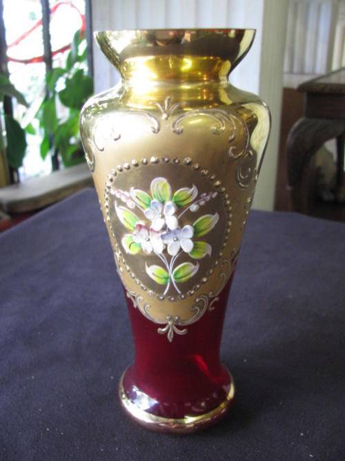.A SIMPLY GORGEOUS RED GLASS BOHEMIAN GILT MURANO , ITALY VASE.. WITH ORIGINAL STICKER......STUNNING PAINTED AND GILDED DESIGN...VINTAGE