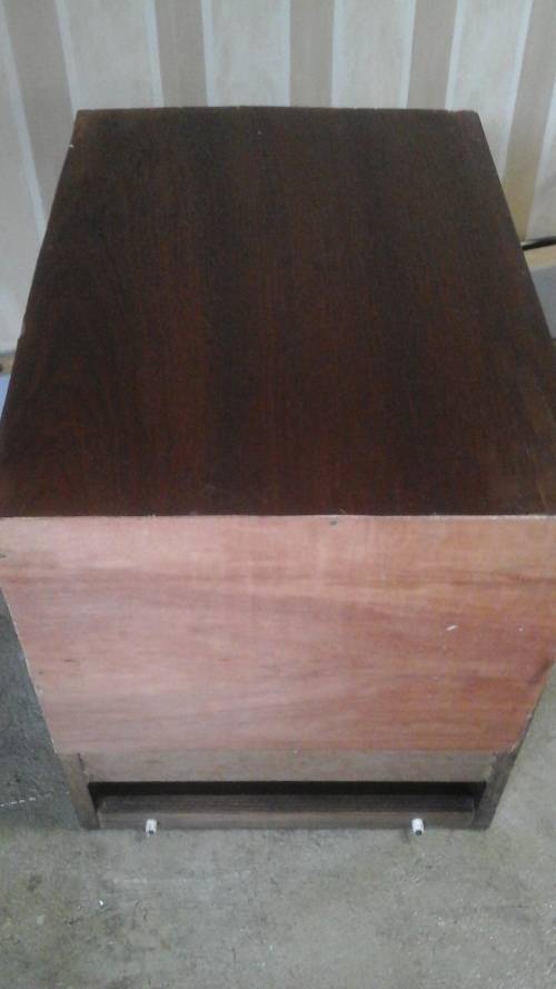 IT HAS THREE SLIDING DRAWERS. IT HAS A KEY HOLE (NO KEY).