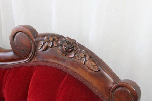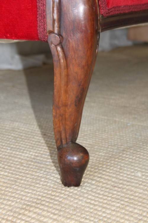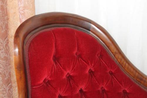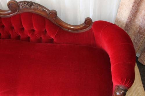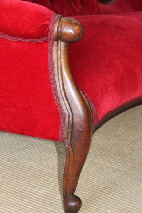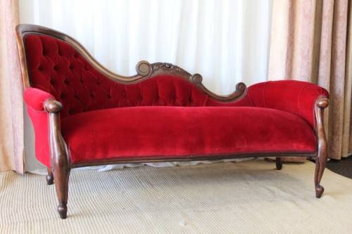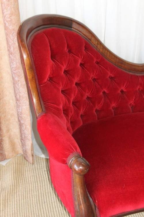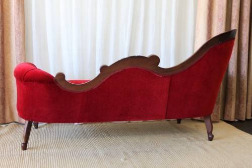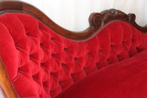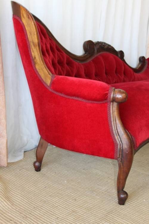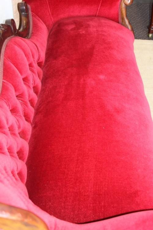 THIS IS A FABULOUS OPPORTUNITY TO ACQUIRE AN ANTIQUE WALNUT BAROQUE CHAISE LONGUE. THE FRAME IS OF SOLID WALNUT WHICH HAS MATURED OVER THE DECADES INTO A RICH WARM COLOUR AND THE DEPTH OF WOOD SHINES THROUGH. THIS IS COMPLIMENTED MOST BEAUTIFULLY BY THE DEEP COLOUR OF THE WINE RED VELVET? UPHOLSTERY. IT HAS THE CLASSIC CURVED HIGH BACK WITH FINE SCROLLED CARVING AND THIS THEME IS CARRIED ON THROUGH TO THE LEGS. A CHAISE WAS DESIGNED TO SIT AGAINST A WALL, AT THE END OF A BED OR AS A ROOM DIVIDER AS IT HAS A FLATTER BACK. THIS CHAISE IS FIRM AND SUPPORTIVE WITH NO LOOSE JOINTS. THE CHAISE MEASURES A VERY DECENT 1720mm LONG x 710mm WIDE x 920mm HIGH. A BAROQUE CHAISE LONGUE IN THE "OSTENTATIOUS " AND VIBRANT DESIGN WOULD GRACE ANY PERIOD HOME AND OF COURSE WOULD LOOK STUNNING IN A LIVING ROOM OR BEDROOM. PLEASE VIEW THE PICS CAREFULLY TO FULLY APPRECIATE THIS TRULY SPECTACULAR PERIOD PIECE AND TO CONFIRM THE CONDITION.