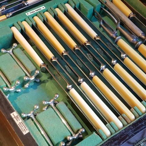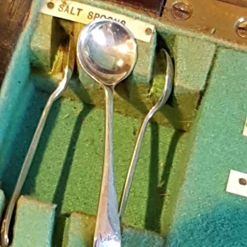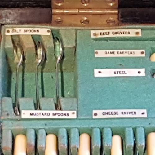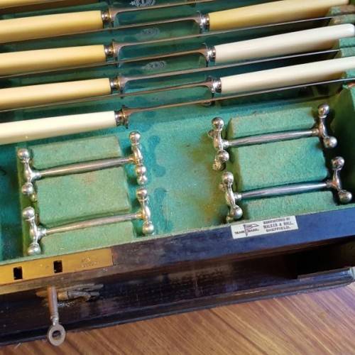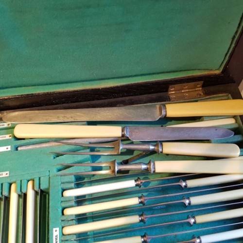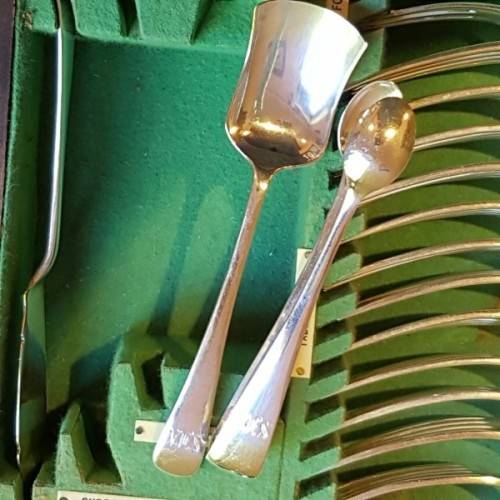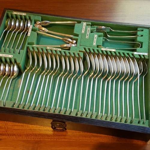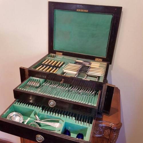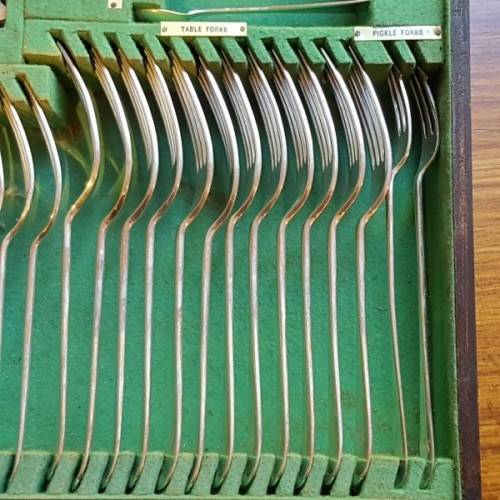 The incredible “made-to-fit wooden cutlery canteen is lined with British Green veld and the set is labelled according to the relevant cutlery pieces. The canteen has its original key. Please view the pics carefully to fully appreciate this truly magnificent hallmarked sterling silver cutlery service and to confirm the condition.