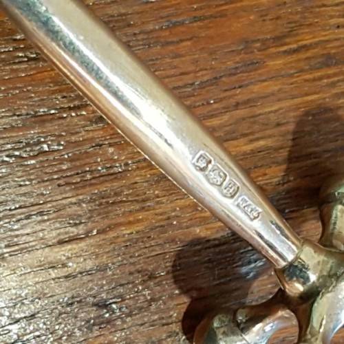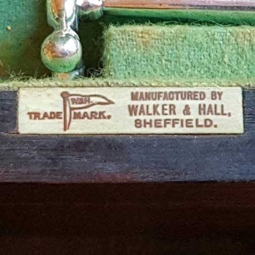 The hallmarks on the set consist of the "Crown" city mark confirming its was made in Sheffield, the Lion passant confirming it is British sterling silver (925) and the letter "c" confirming it was made in 1920 and the makers stamp (assay) confirms the set was made by Walker & Hall Silversmiths of Sheffield.