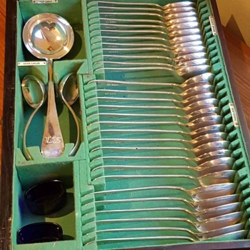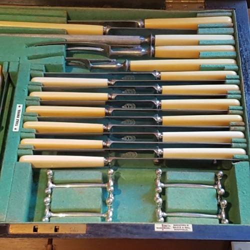This spectacular antique English made “Hallmarked” sterling silver “Walker & Hall” boxed 12 place setting cutlery service is in remarkable condition and includes everything from your normal knives, forks, spoons etc. to nut crushers, salt & mustard spoons, knife rests, carvers, cheese knives, a knife steel, pickle forks, assorted ladles, sugar tongs, sugar spoons and lots more, each displayed on trays in the canteen. The blades on the knives are non-stain steel with bone handle style handles. The pieces are monogrammed with the initials “SFA”.