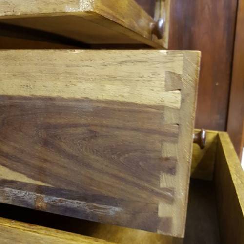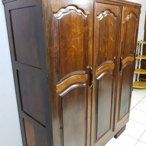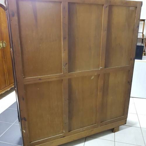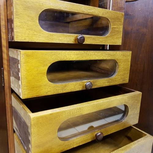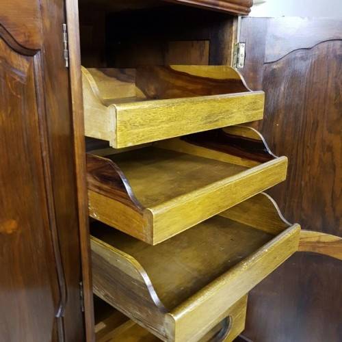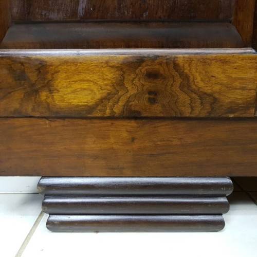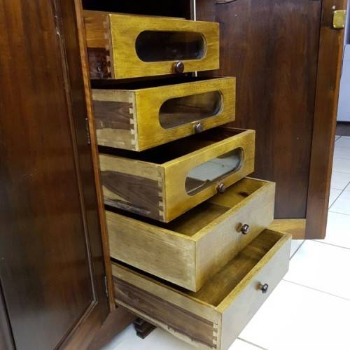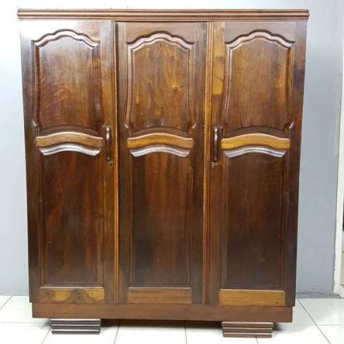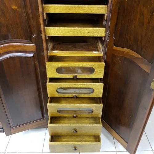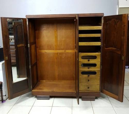 This stunning Art Deco three-door solid Imbuia wardrobe has eight good size storage drawers/ sliding shelves and has loads of hanging space with a mirror in the left hand door. This stunning and extremely sturdy cupboard measures a stunning 155cm long x 57cm wide x 183cm high. The wardrobe is in awesome condition with absolute minimal/ normal age and usage related wear and tear. The wardrobe is very well made sits solidly on the ground. This is a very beautiful and superbly crafted wardrobe that was made to stand the test of time. The wardrobe has stunning Art Deco legs and most likely dates to the late 1940's or early 1950's. Please view the pics carefully to fully appreciate this truly awesome wardrobe and to confirm the condition.