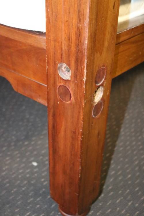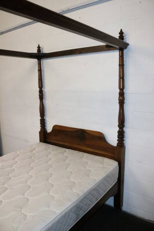 This spectacular Burmese teak four-poster canopy double bed is an amazing find and truly looks incredible. The craftsmanship that went into making this is evident in the sheer quality and magnificence of this bed. This amazing bed measures 205cm long x 140cm wide x 221cm high to the top of the posters. The bed comes with a thick and comfortable "Celebrity Sleep" mattress. The bed has some minor wear and tear and a few scuffs hear and there but it really does not detract from the bed. This would be an amazing addition to any bedroom. Please view the pictures carefully to fully appreciate this truly amazing bed and to confirm the condition.