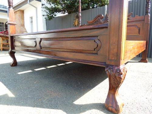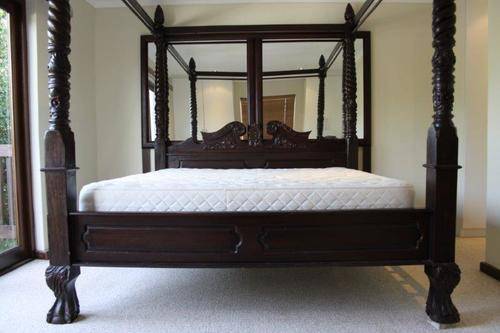 WE ARE OFFERING A MAGNIFICENT MAJESTIC SOLID MAHOGANY SUPER KING HAND CARVED CHIPPENDALE STYLE FOUR POSTER CANOPY BED IN FANTASTIC CONDITION FOR THE AGE!!! THIS PARTICULAR BED COMES WITH THE HUGE DETAILED HEADBOARD, BALI TWIST HAND CARVED DETAILED POSTS, A SOLID FOOTBOARD, TWO SIDES AND THE TOP CANOPY SECTION!!! THE DETAIL IS ABSOLUTELY SPECTACULAR AND THE RETAIL COST OF THIS PARTICULAR BED NOW RUNS OVER R50k SO GRAB THIS ONE WHILE YOU CAN!!! Please note this bed has some age related wear and has had some repairs.THE BED MEASURES APPROXIMATELY 215cm WIDE, 233cm LONG AND 245cm HIGH.from bid or buy:- http://www.bidorbuy.co.za/article/6290/Chippendale_Furniture