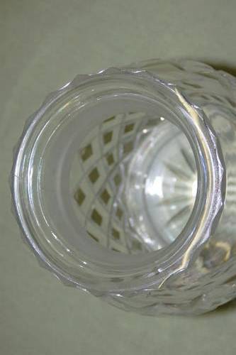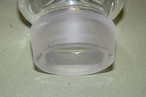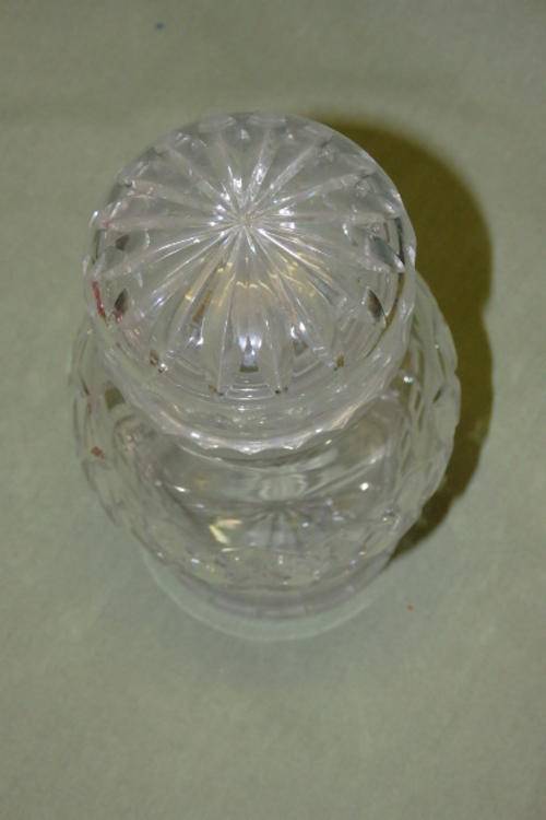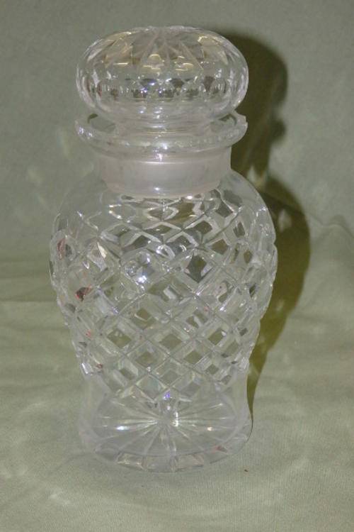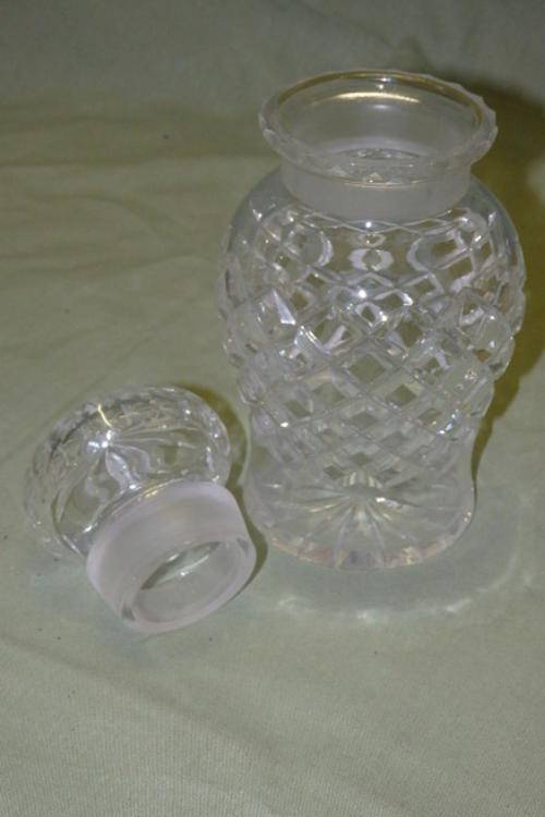 THIS SPECTACULAR CUT CRYSTAL SALTS BOTTLE HAS A STUNNING CRISS-CROSS DESIGN DETAILING AND A CRYSTAL STOPPER. THE BOTTLE MEASURES 16cm TALL AND HAS AN ABSOLUTELY TINY CHIP ON THE RIM OF THE STOPPER. THERE IS MINOR USAGE RELATED WEAR AND TEAR. THIS IS A VERY BEAUTIFUL BOTTLE THAT WOULD LOOK AMAZING ON A LADIES DRESSING TABLE.