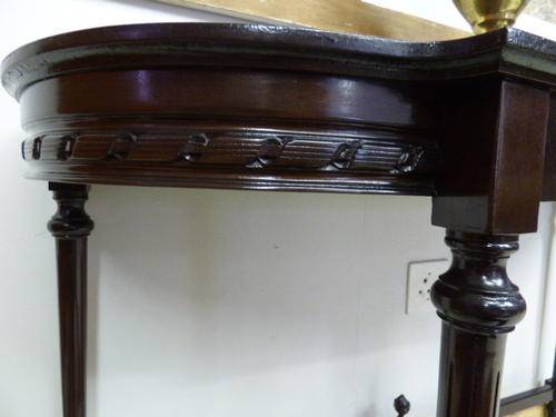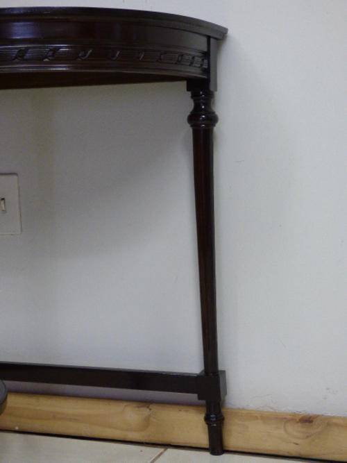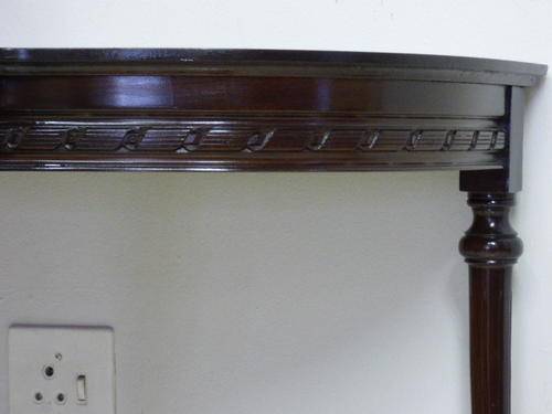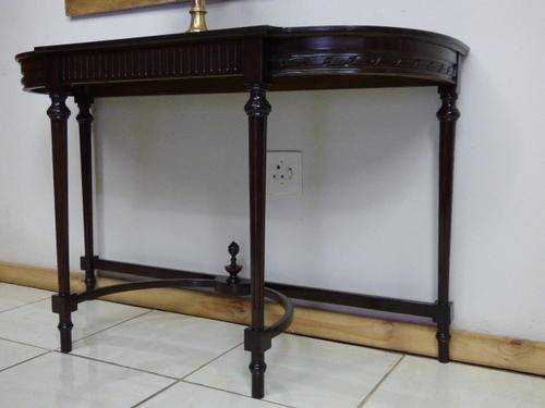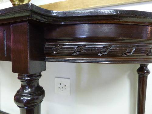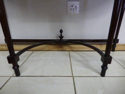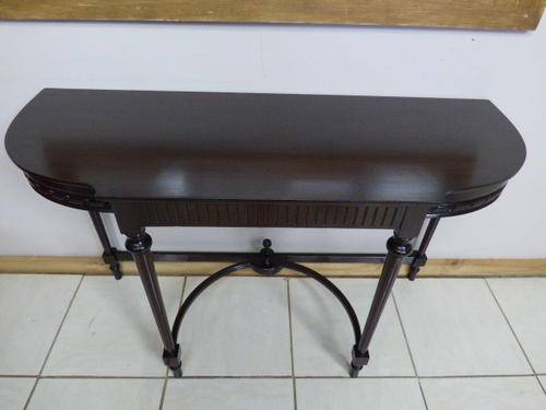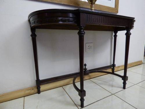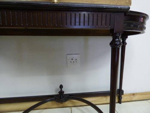 THIS BEAUTIFUL AND VERY STYLISH OCCASIONAL/ DISPLAY TABLE IS DAINTY BUT SOLIDLY BUILT! IT IS AN EXQUISITE TABLE, WITH BEAUTIFUL DETAILED PATTERNS ON THE FRONT AND HAS GORGEOUS REGENCY LEGS WITH A FINIAL AT THE BOTTOM!!! THE TABLE IS APPROXIMATELY 46cm x 124cm x 77cm HIGH. THIS IS A VERY STRIKING TABLE AND EXTREMELY EYE-CATCHING!! CLASSY AT A WHOLE NEW LEVEL.