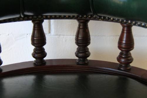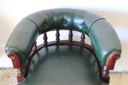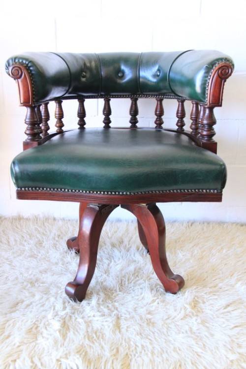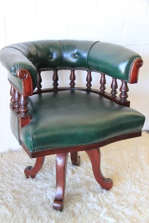 This absolutely beautiful mahogany "captain's swivel chair" has loads of character and is an incredible chair with loads of substance!!. The chair is in great condition for its age with some minor age and usage related wear and tear. This stunning chair features period British green vinyl upholstery with lovely nail strips throughout the chair. These captain's chairs are highly collectable and this one would be an absolute highlight in any collection! It is truly magnificent. The chair measures approximately 63cm long x 66cm wide x 79cm high. Please view the pics carefully to fully appreciate this wonderful captain's chair and to confirm the condition.
