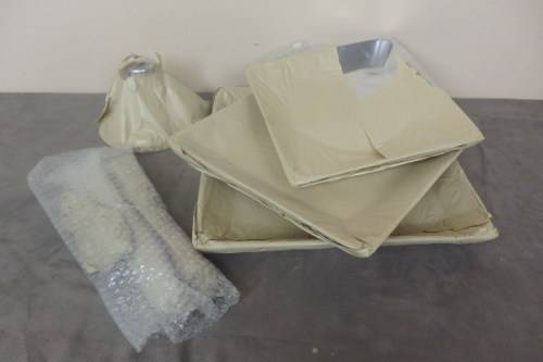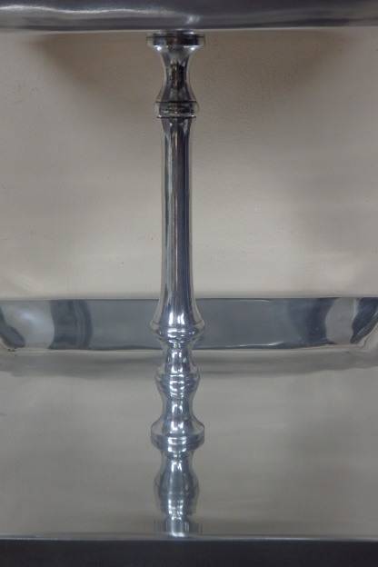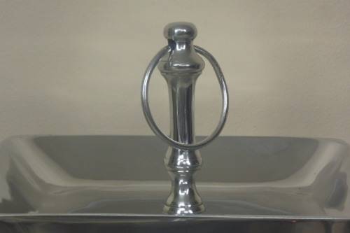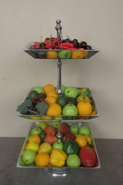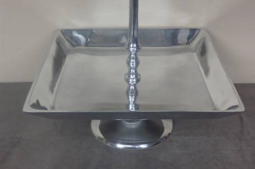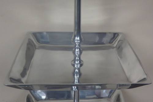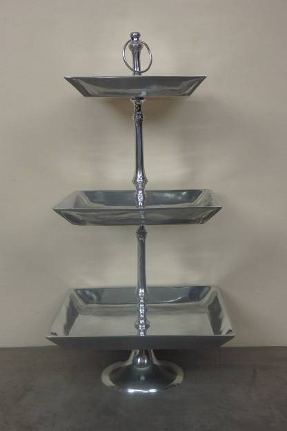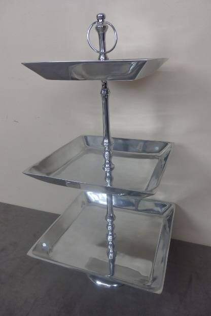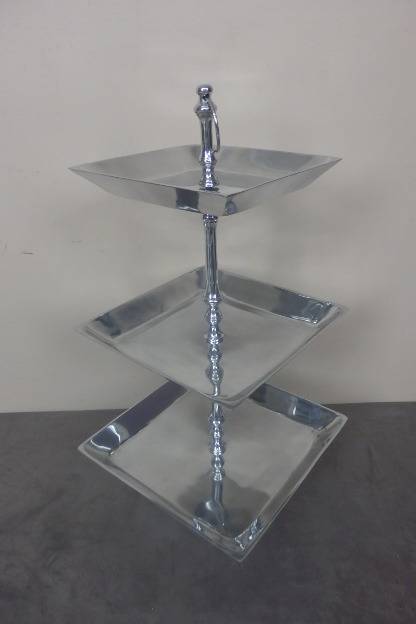 THIS SPECTACULAR (VERY-LARGE) STEMMED 3-TIER "SQUARE" BRUSHED ALUMINIUM CAKE/ PASTRY STAND IS IN AMAZING CONDITION AND IS STILL PACKAGED IN ITS ORIGINAL BOX AND PROTECTIVE WRAPPING. THE STAND CAN BE ASSEMBLED WHEN NEEDED. THE CAKE STAND WOULD MAKE AN INCREDIBLE STAND FOR INDIVIDUALLY WRAPPED WEDDING CAKE OR AS A PASTRY/ DESSERT STAND AT A FUNCTION ETC. THE STAND MEASURES A VERY DECENT 800mm HIGH (EXCLUDING THE CARRY RING) AND THE THREE SQUARE TIERS ARE (TOP) 295mm x 295mm, (CENTRE) 355mm x 355mm AND (BOTTOM) 400mm x 400mm. THERE ARE ABSOLUTE MINIMAL SCUFFS AND THE STAND HAS BEEN WELL PROTECTED IN ITS WRAPPING. THE ASSEMBLY INSTRUCTIONS ARE ALSO IN THE BOX.