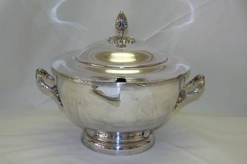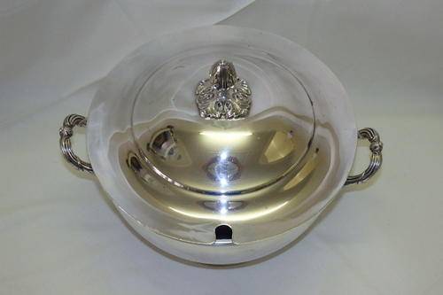 THIS SPECTACULAR VINTAGE MAPPIN & WEBB OF LONDON SILVER PLATED LIDDED DOUBLE HANDLED TUREEN WITH A LADLE SLOT IN THE LID MEASURES 26cm (HANDLE TO HANDLE) x 21cm ACROSS THE RIM x 20.5cm HIGH. THE TUREEN IS A 3.5 PINT TUREEN (1.6 LITRES). THERE IS MINOR AGE AND USAGE RELATED WEAR AND TEAR AND SCUFFS ETC, BUT IT IS STILL IN PRETTY GOOD CONDITION FOR ITS AGE. THE DETAILING ON BOTH THE HANDLES AS WELL AS ON THE LID HANDLE AND AROUND THE RIM OF THE TUREEN IS IN TRUE MAPPIN AND WEBB FASHION. THIS IS AN EXQUISITE PIECE. PLEASE VIEW THE PICS CAREFULLY FOR THE GENERAL CONDITION.