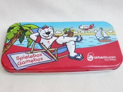 A TIN 'SPIELEBOX' THAT IS GIVEN OUT BY AIR BERLIN TO AMUSE THE KIDS DURING FLIGHT. BOX MEASURES 19CM X 9CM X3CM AND CONTAINS 3 GAMES. IN VERY GOOD CONDITION WITH PLAY INSTRUCTIONS/RULES. REFER IMAGES