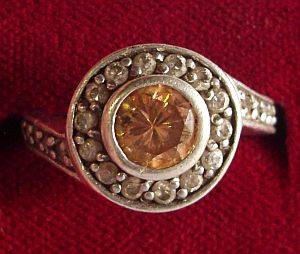 A very striking sterling silver ring . I tried identifying the orange stone and leave you to decide , either Clinohumite or Hessonite (Garnet) which seems more fitting for jewellery .