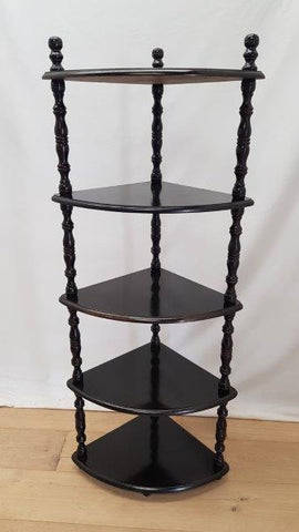 This stunning vintage 5-even-tiered dark stained corner whatnot display shelf is in lovely condition for its age with minimal age and usage related wear and tear. The display shelf measures 133cm tall x 54cm long x 37 cm wide. This is the ideal unit for same size ornaments such display plates or figurines or even framed family photographs. The beautiful turned uprights are finished with round finials.