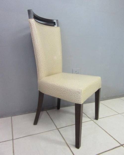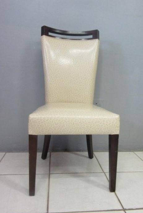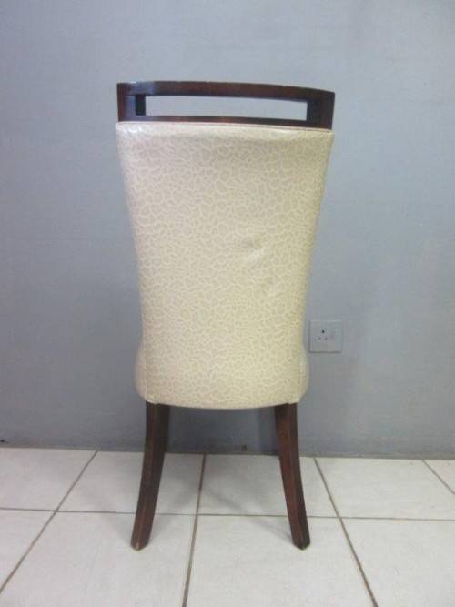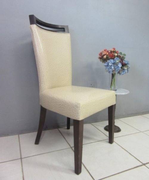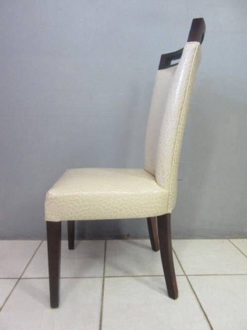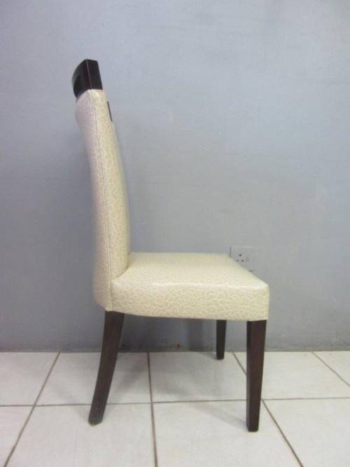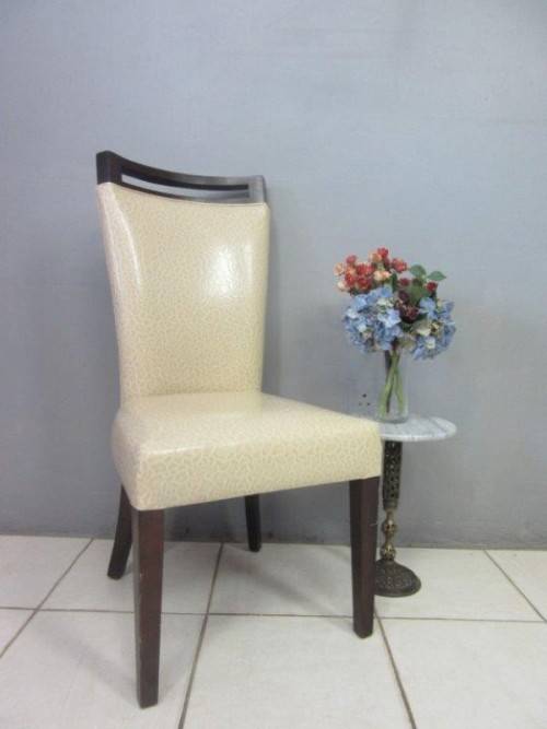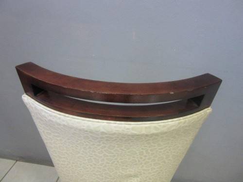 This stunning and extremely stylish high-back occasional chair is upholstered in a superb ivory colour patent-leather feel fabric and measures 111cm high x 53cm long x 53cm wide. The chair would be ideal for a focal chair in a living room with a table lamp on the side or as a spare chair in a dining room. The patent-leather feel fabric has a stunning stylish print pattern and the dark wood and ivory colour fabric makes it a particularly attractive occasional chair. The chair has minimal/ normal usage related wear and tear. Please view the pics carefully to fully appreciate this beautiful modern designed occasional chair and to confirm the condition.