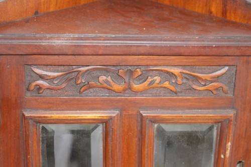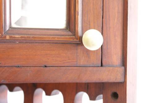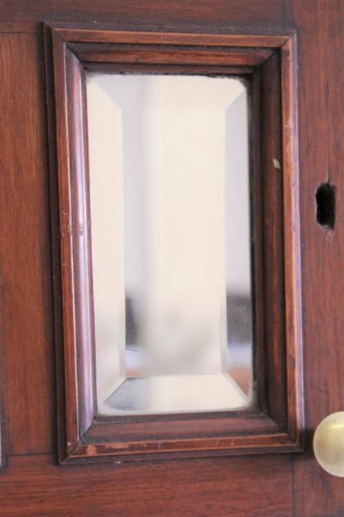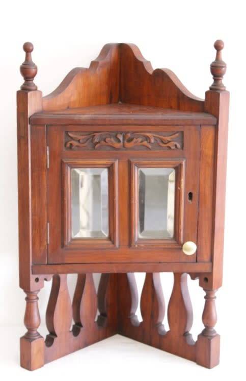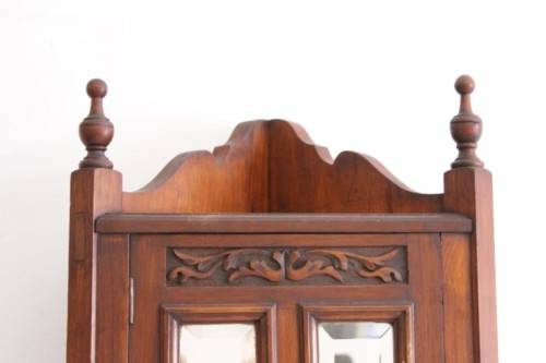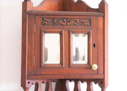 This stunning and very well made antique solid oak bathroom corner vanity cabinet with bevelled mirrors and carved detailing measures a decent 61.5cm high x 39cm long x 21.5cm deep. The cabinet is solidly made and has awesome weight to it. The door has a round brass knob. This is the ideal cabinet for a Victorian or Edwardian bathroom and would look amazing above a round corner table. Please view the pictures carefully to fully appreciate this gorgeous solidly makes oak corner cabinet and to confirm the condition.