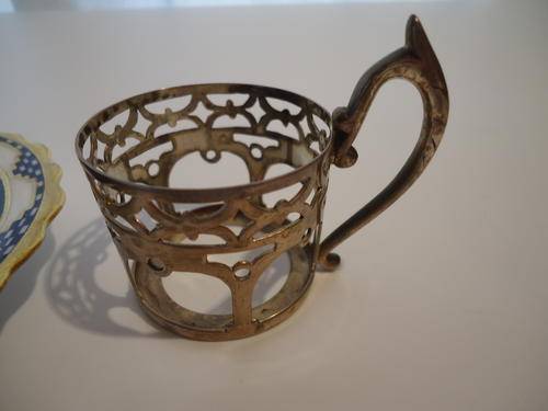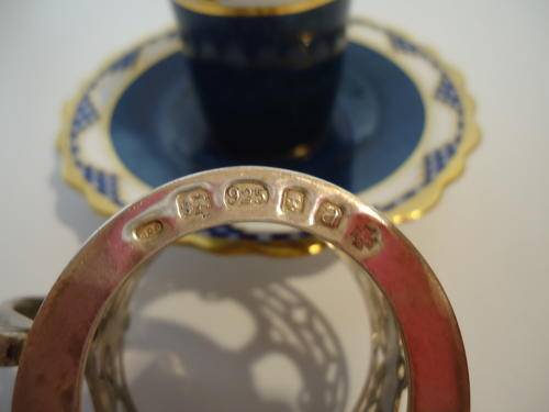 A FABULOUS AYNSLEY COFFEE CUP AND SAUCER WITH A STERLING SILVER HOLDER OF 38g. THE CUP IS 5.5cm TALL AND THE SAUCER IS 12cm ACROSS, THEY DATE TO THE EARLY PART OF THE 1900's BUT THE SILVER HOLDER IS A MORE MODERN REPLACEMENT.