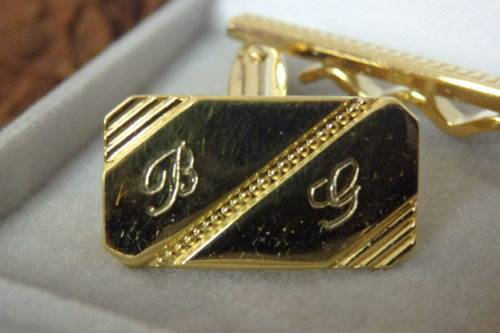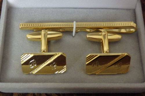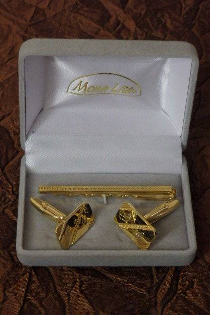 THIS STUNNING SET OF "MODERN" MONA LISA GENTS GOLD PLATED CUFF LINKS WITH MATCHING TIE PIN ARE STILL IN THEIR ORIGINAL BOX AND ARE IN GREAT CONDITION WITH ABSOLUTE MINIMAL AGE AND USAGE RELATED WEAR AND TEAR. THE PERFECT GIFT FOR A GENT!!!
