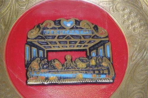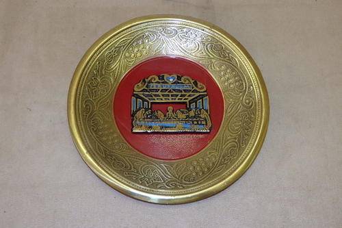 THIS STUNNING BRASS WALL PLATE WITH A JERUSALEM AND THE LAST SUPPER DECAL SET ONTO THE PLATE MEASURES 19cm ACROSS. THE DECAL IS SET ONTO A RED ENAMEL EFFECT BACKGROUND AND HAS A WALL HANGER ON THE BACK OF THE PLATE.THE BRASS WORK ALSO HAS LOVELY DETAILING IN IT.