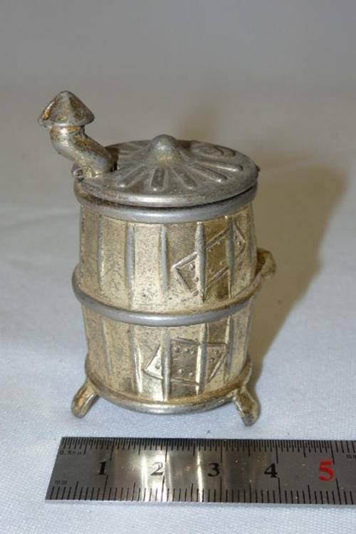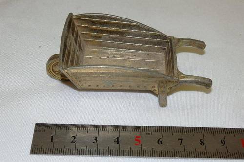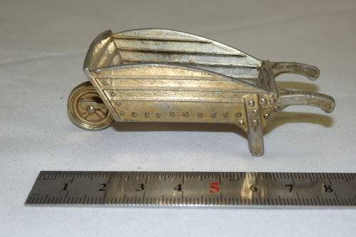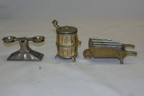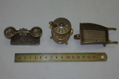 THIS FANTASTIC COLLECTION OF THREE ASSORTED BRASS PLATED ORNAMENTS INCLUDE A VINTAGE WHEELBARROW, A TABLE SCALE AND A BARREL HEATER. THE ORNAMENTS ARE ROUGHLY BETWEEN 4cm AND 8cm.