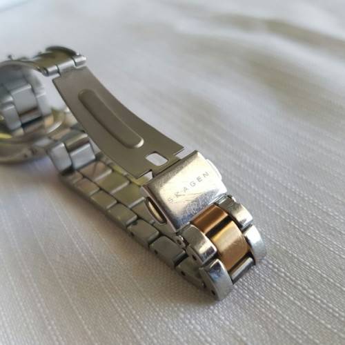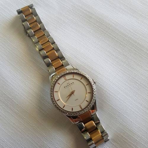THIS STUNNING DANISH MADE "SKAGEN" MODEL #347SSRX LADIES TWO-TONE STAINLESS STEEL WATCH WITH A SWAROVSKI CRYSTAL BEZEL IS IN EXCELLENT CONDITION AND MEASURES 30mm ACROSS THE DIAL. THIS IS A STUNNING QUARTZ WATCH WITH ABSOLUTE MINIMAL WEAR AND TEAR AND SCUFFS. THIS BEAUTIFUL AND VERY ATTRACTIVE LADIES WATCH IS THE IDEAL WEAR ANYWHERE WATCH THAT WOULD LOOK STYLISH AND CLASSY WITH ANY OUTFIT. THE TWO-TONE STEEL STRAP HAS SLIGHT TARNISHING. PLEASE VIEW THE PICS CAREFULLY TO FULLY APPRECIATE STYLISH DANISH MADE SKAGEN WATCH AND TO CONFIRM THE CONDITION.