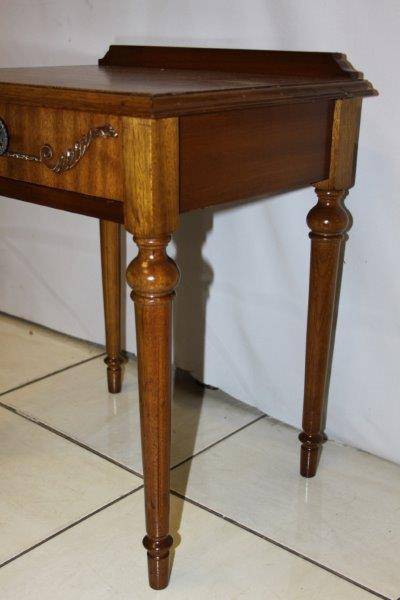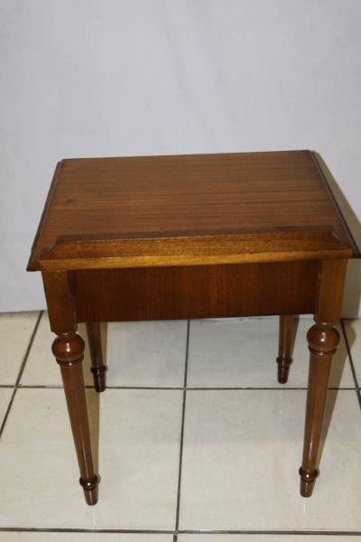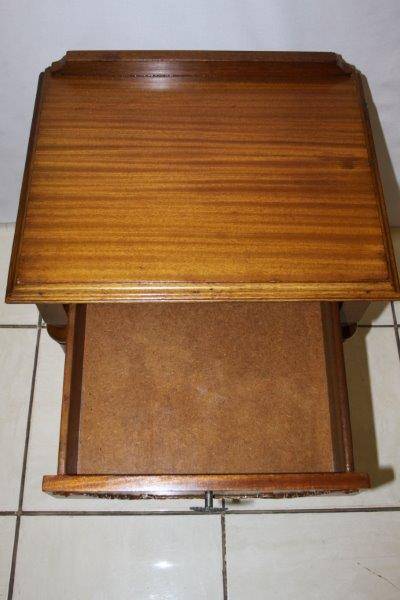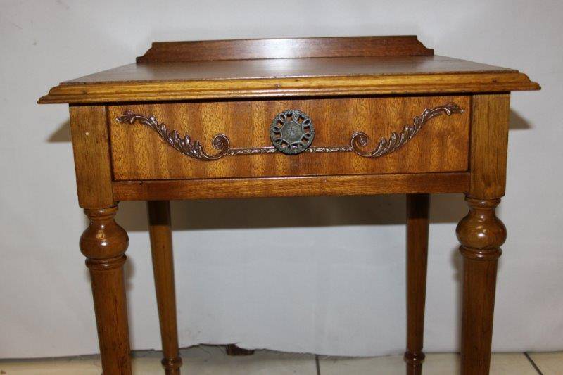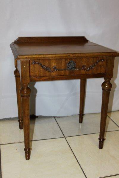 A VERY BEAUTIFUL VINTAGE SIDE TABLE PEDASTAL WITH A DRAW AND FANTASTIC DETAIL IS IN GOOD CONDITION!!! THE DETAIL IS REALLY EXCELLENT AND IT'S VERY STABLE ON THE GROUND HOWEVER IT HAS BEEN PREVIOUSLY REPAIRED ON THE SIDE (VIEW PICS)!!! THE SIZE IS APPROXIMATELY 520mm x 410mm x 610mm HIGH. PLEASE VIEW THE PICS CAREFULLY FOR MORE DETAIL AND CONDITION AS THIS FORMS PART OF THE DESCRIPTION. WHAT YOU SEE IS WHAT YOU GET!!! POSTAGE IS NOT POSSIBLE SO PLEASE ARRANGE FOR COLLECTION IN EDENVALE!