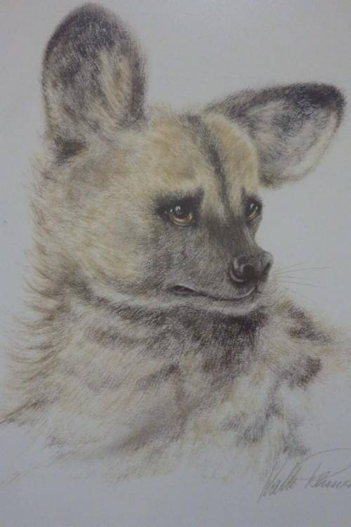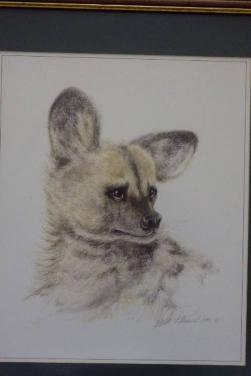 THIS STUNNING FRAMED (BEHIND GLASS) PRINT OF AN AFRICAN WILD DOG WITH AMAZING DETAILING IS SIGNED, BUT I AM NOT ABLE TO MAKE OUT THE ARTISTS SIGNATURE. THE PRINT IS FRAMED IN A WOODEN FRAME AND MEASURES 49.5cm x 56.5cm. THERE ARE SOME SCUFF MARKS/ WEAR AND TEAR ON THE FRAME, BUT IT IS STILL A PRETTY INCREDIBLE PICTURE.