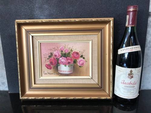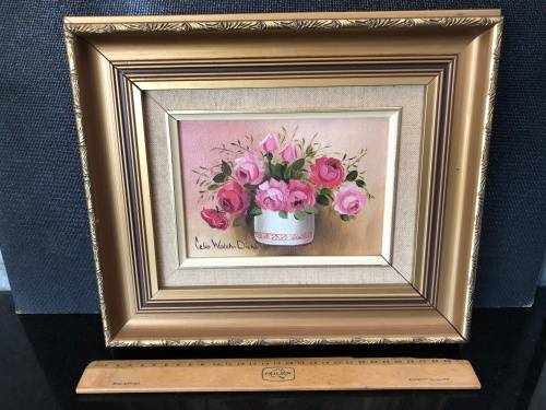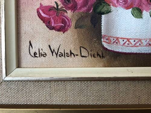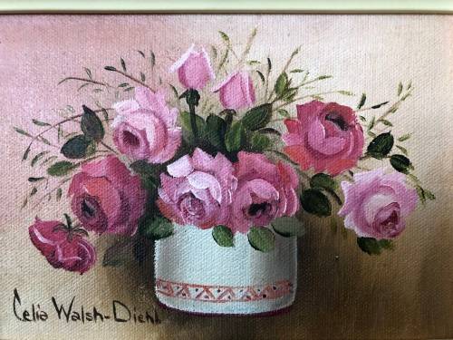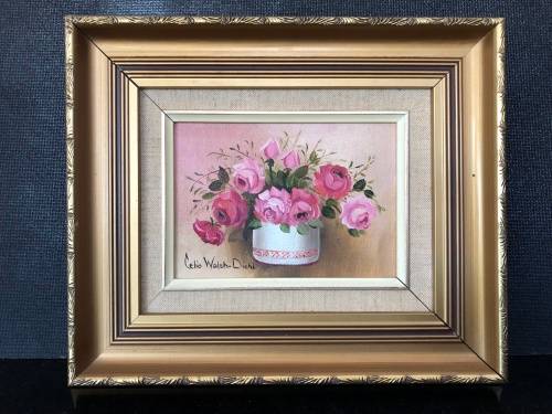A STUNNING FRAMED ORIGINAL SIGNED "CELIA WALSH-DIEHL" (1915-1993) OIL PAINTING ON BOARD OF FLOWERS