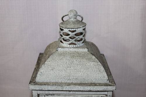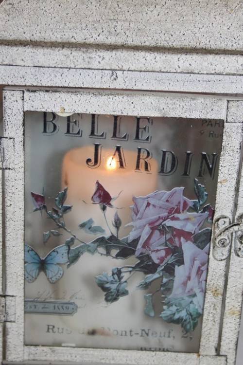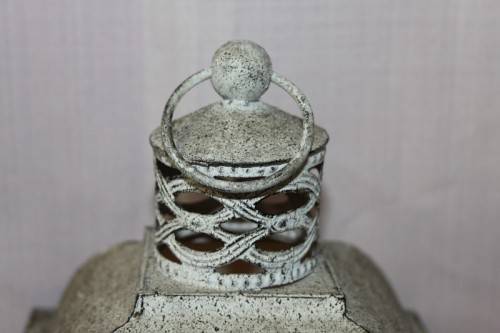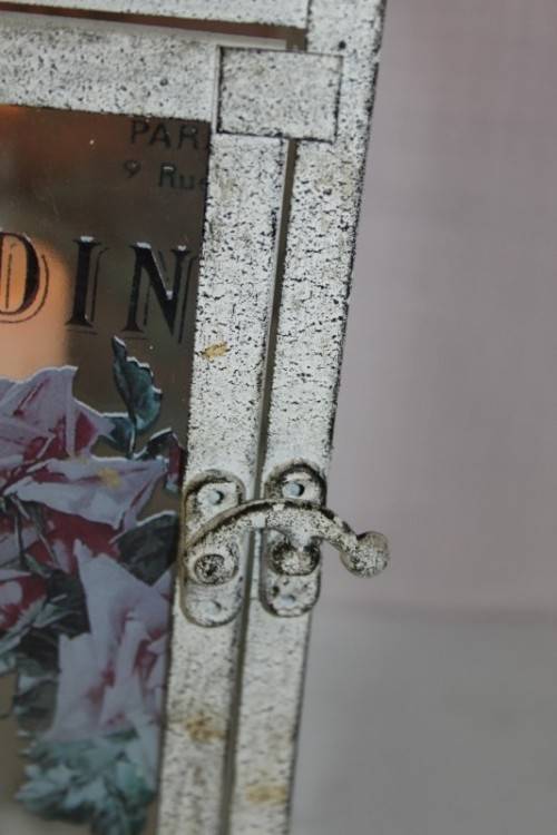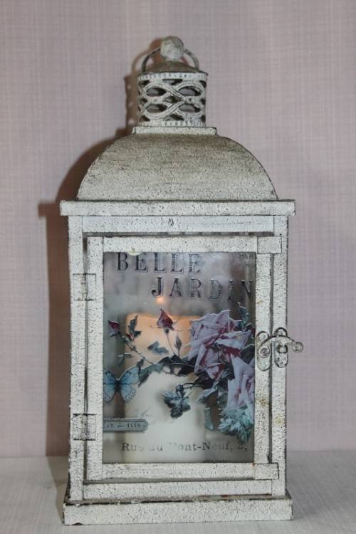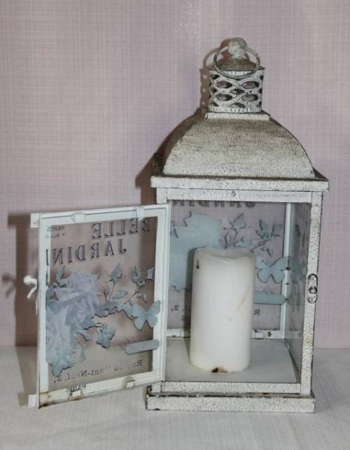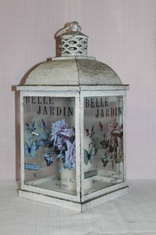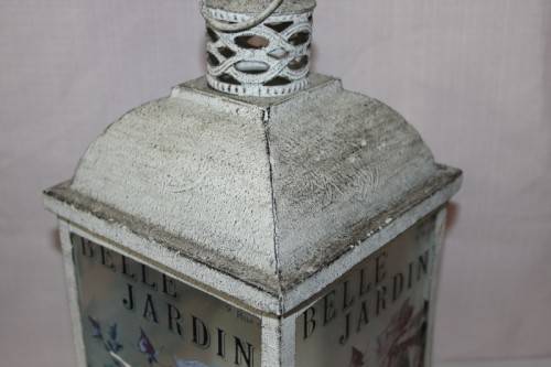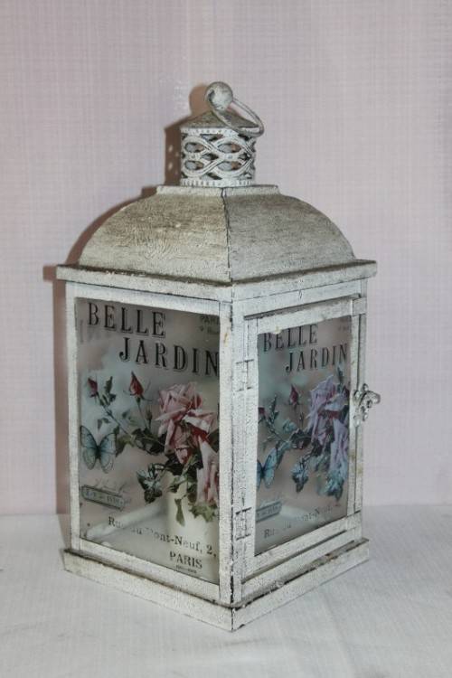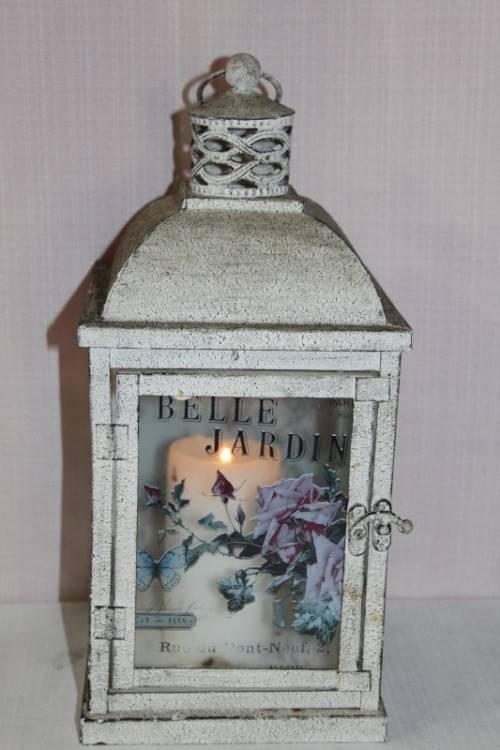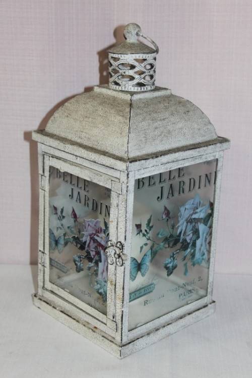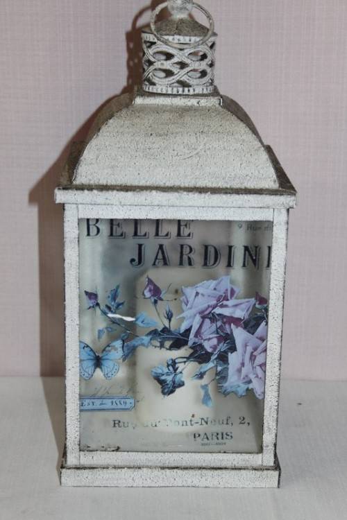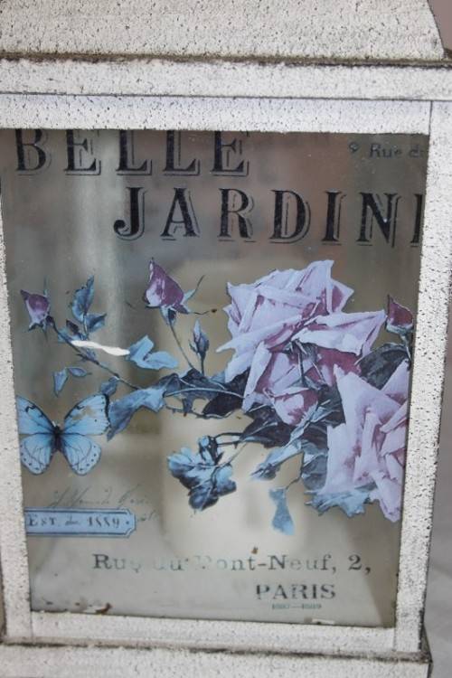 THIS STUNNING FULL SIZE WHITE DISTRESSED "BELLE JARDINIERE - PARIS" METAL LANTERN IS IN AWESOME CONDITION AND STILL HAS THE ORIGINAL CANDLE IN IT. THE LANTERN HAS A RING ON THE TOP SO IT CAN BE HUNG FROM THE ROOF TOO. THE LANTERN MEASURES 345mm HIGH x 165mm WIDE x 165mm LONG. EACK OF THE FOUR GLASS PANELS ARE DECORATED WITH BELLE JARDINIERE PICTURES, AND THE ONE SIDE OPENS TO ALLOW YOU TO LIGHT/ CHANGE THE CANDLE. PLEASE VIEW THE PICS CAREFULLY TO FULLY APPRECIATE THIS STUNNING DECORATIVE LANTERN AND TO CONFIRM THE CONDITION.