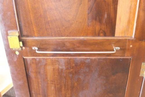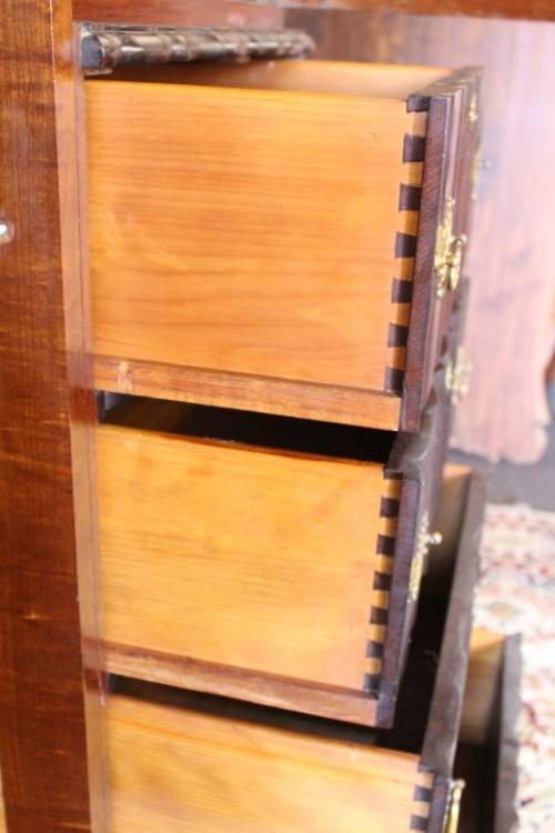 This stunning original GSH Ruvee solid Imbuia ball & claw wardrobe with hanging and packing space and four drawers is a stunning and beautifully made piece of furniture. The entire left side of the wardrobe is allocated to hanging space and the right hand side of the wardrobe consists of a cupboard with a shelf for packing space and four drawers below it. The wardrobe has solid brass handles (some of the handles are missing on the drawers) which could be replaced. The wardrobe measures 110cm long x 60cm wide x 190cm high. There is minimal/ minor age and usage related wear and tear and scuffs and this wardrobe is a well made, solidly built piece that one would expect from GSH Ruvee furniture. I may be wrong, but the inside looks to be "lined" in a camphor wood. There are no keys. Please view the pictures carefully to fully appreciate this stunning wardrobe and to confirm the condition. Please view the shipping options or request courier costs prior to purchasing any of our products.