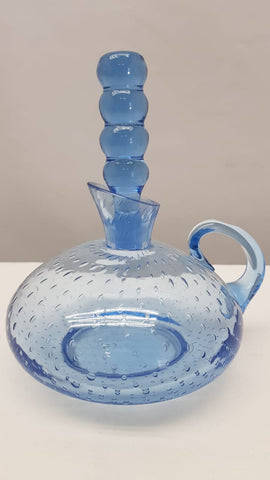 This stunning hand blown blue glass carafe decanter with a gorgeous solid stopper is in great condition with no visible chip or cracks in the glass. The decanter is 20cm high including the stopper and 16cm wide. The decanter would be ideal for a cordial or fruit syrup or even vino or oils.