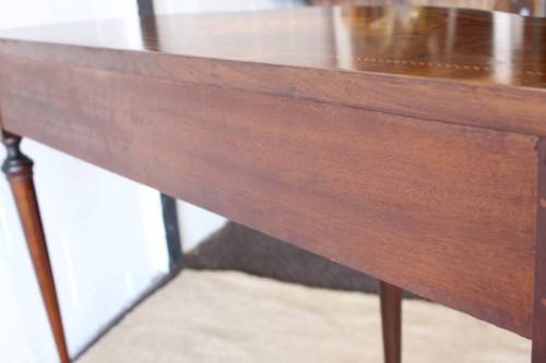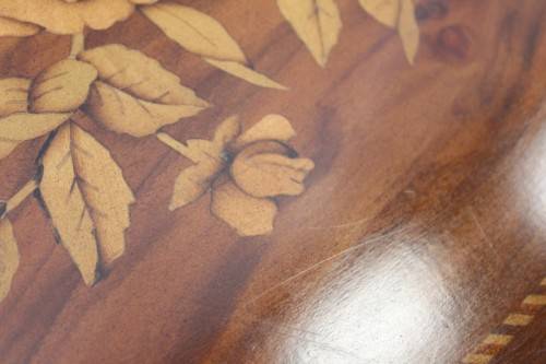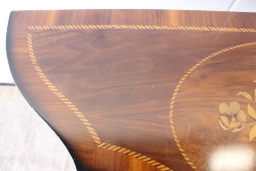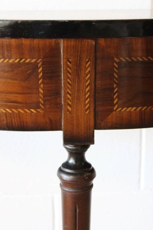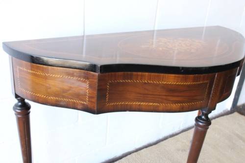 This stunning and beautifully made Italian "half-moon" console table with incredible floral marquetry and rail inlay detailing measures 107cm long x 42cm wide x 76cm high. The table has a broad skirting with rail inlay detailing and the table rests on three tapered turned legs. The table in in great vintage condition with normal age and usage related wear and tear and scuffs etc and there has been a mend to the one leg at the back (see pics). The table would look incredible below an ornate period style mirror in an entrance hall or passage or even in a bedroom or reception area. Please view the pics carefully to fully appreciate this absolutely beautiful console table with marquetry and rail inlay detailing and to confirm the condition.