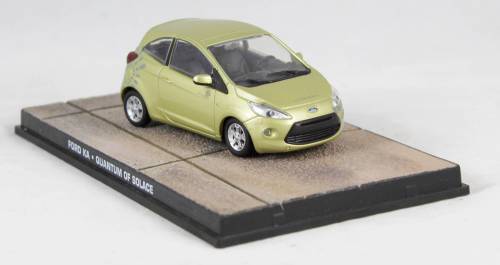 A stunning 1/43 scale Ford KA model from the James Bond movie 'Quantum Of Solace' This die cast model is in good condition but does not come with the plastic dome or box. Offered at a giveaway price, act fast and bid now!!