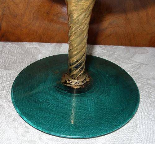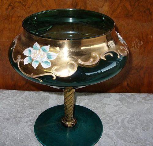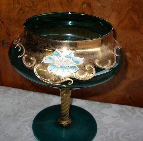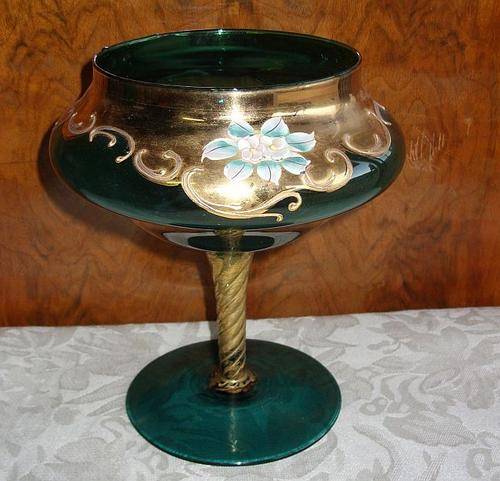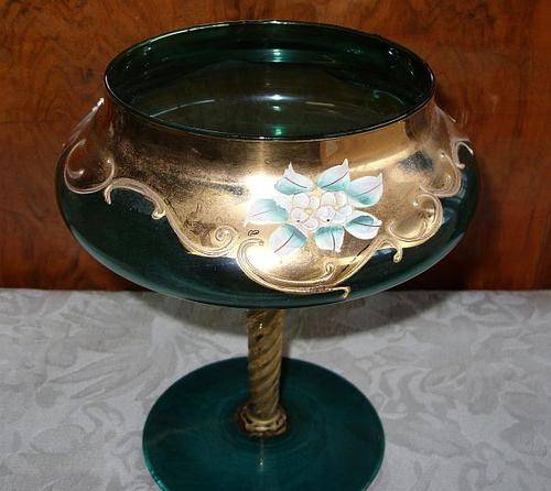 A stunning large Venetian glass stemmed bowl with gold overlay and hand painted decoration . The style is 1970s .