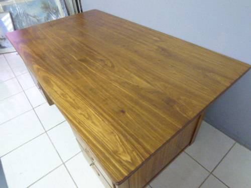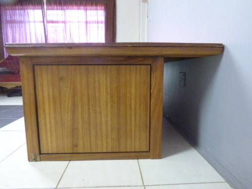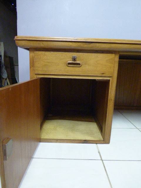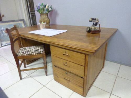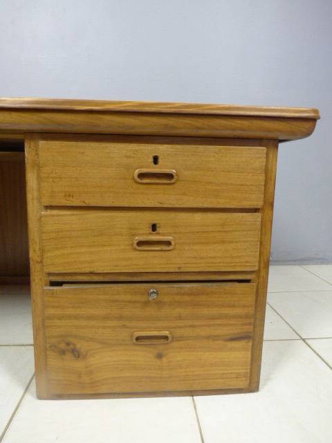 A STUNNING LARGE TEAK/KIAAT?? VINTAGE EXECUTIVE DESK WITH A LARGE TOP. THIS DESK HAS TONS OF CHARACTER AND IS IN GOOD CONDITION! IT WILL ADD A WARMTH TO YOUR STUDY/ OFFICE AND COULD BE USED FOR A LARGE WORKTOP. IT IS MADE UP OF A WOOD AND VENEER COMBINATION. THERE ARE THREE DRAWERS AND A LARGE CUPBOARD AND DRAWER ON THIS DESK. IT MEASURES APPROXIMATELY 113cm x 198cm x 67cm HIGH. THIS IS AN EYE-CATCHING PIECE OF FURNITURE WITH AMPLE WORK SPACE.