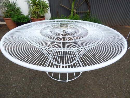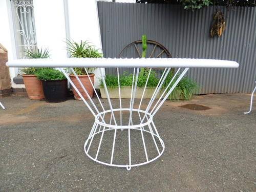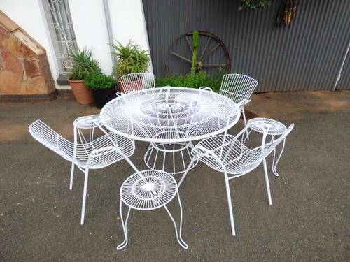 AN AWESOME, STYLISH MILD STEEL PATIO SUITE!! THIS SET HAS BEEN NEWLY SAND BLASTED AND POWDER COATED SO IT'S VIRTUALLY BRAND NEW!!! IT COMES WITH A STUNNING ROUND TABLE THAT MEASURES 130cm ACROSS AND 64cm HIGH. THERE ARE FOUR MATCHING CHAIRS AND FOUR SMALLER SIDE TABLES. IT HAS BEAUTIFUL DETAIL AND WILL MAKE AN AMAZING FEATURE IN YOUR POOL AREA OR ON YOUR PATIO.