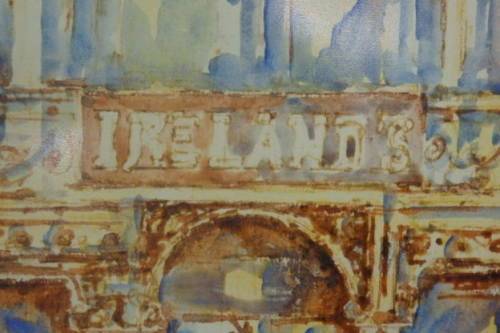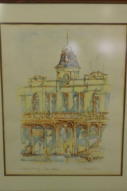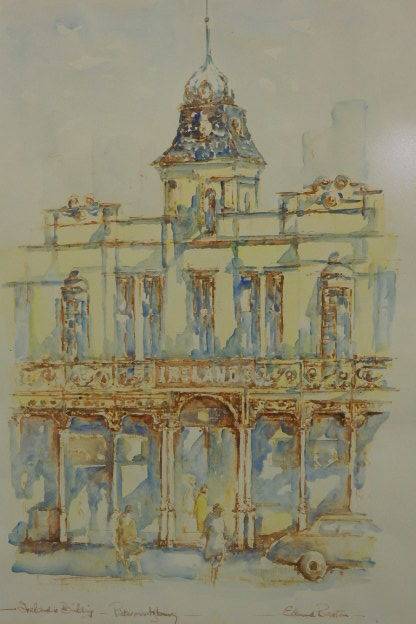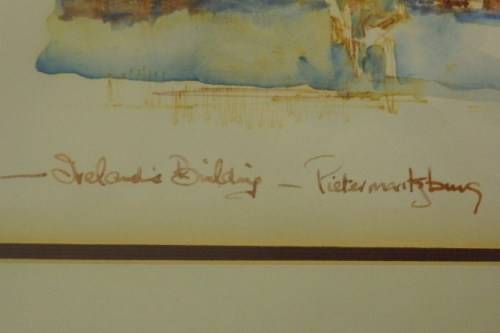 THIS EXQUISITE ORIGINAL WATERCOLOUR PAINTING OF "IRELAND'S BUILDING - PIETERMARITZBURG" BY INTERNATIONAL ARTIST EDMUND BARTON (LIVING IN SOUTH AFRICA) IS PART OF HIS HISTORICAL SOUTH AFRICAN BUILDING COLLECTION WHICH I BELIEVE WAS A SPECIFICALLY COMMISSION. THE PAINTING IS FRAMED BEHIND NON-REFLECTIVE GLASS IN A SOLID WOODEN FRAME. THE PAINTING IS IN BEAUTIFUL CONDITION AND MEASURES 570mm WIDE x 675mm HIGH. HIS APPLICATION OF COLOURS AND ATTENTION TO DETAILING MAKES THIS ENTIRE COLLECTION A MASTER PIECE. THE PAINTING IS SIGNED AND THE TITLE INSCRIBED ON THE PAINTING. YOU ARE WELCOME TO VIEW THE COLLECTION AT OUR EDENVALE BRANCH.