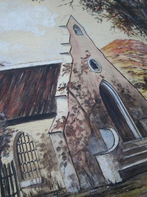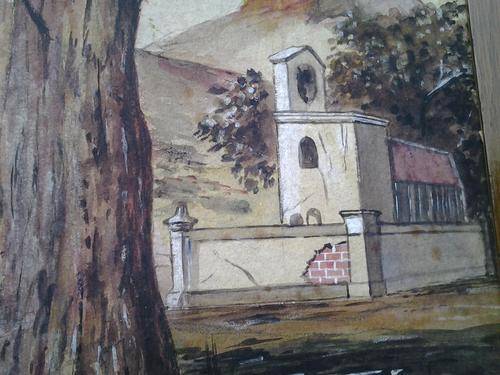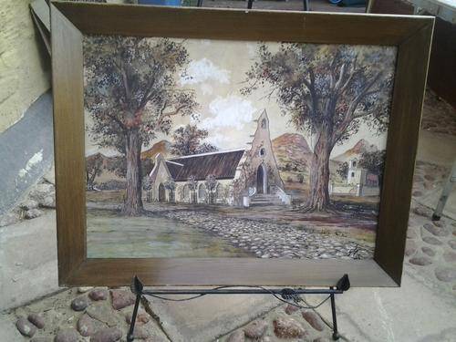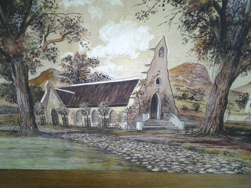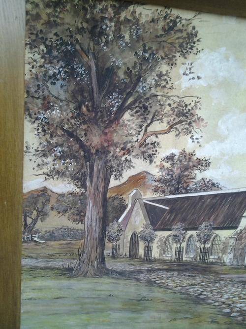 It is a painting of an Old Cape Dutch house with lots of intricate details within the painting.