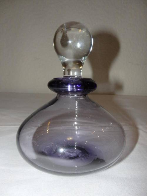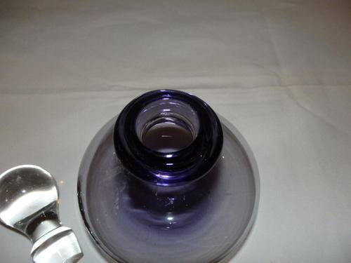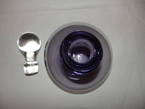 THIS STUNNING DEEP PURPLE GLASS APERITIF/ DIGESTIF DECANTER WITH A CLEAR GLASS STOPPER MEASURES 13.8cm TALL. THE DESIGN OF THE DECANTER IS AN UNCOMPLICATED DESIGN AND THE STOPPER COMPLEMENTS THE DECANTER BEAUTIFULLY. THE DECANTER IS IDEAL FOR THE LIKES OF BITTERS AND WOULD BAKE A SUPERB AND VERY CLASSY ADDITION TO YOU CRYSTAL DECANTER COLLECTION. THERE ARE NO CHIPS OR CRACKS IN THE DECANTER.
