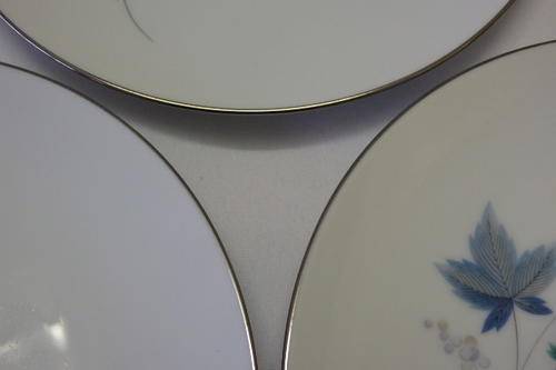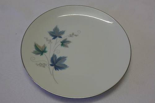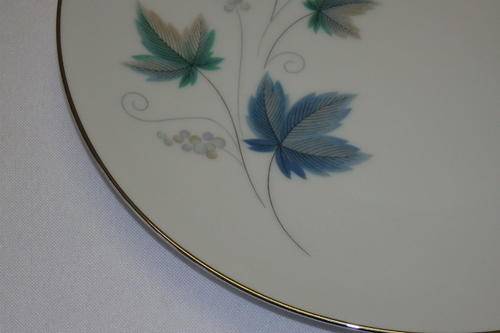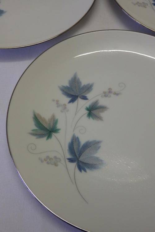 THIS STUNNING "ROYAL CERAMICS" BY NORITAKE OF JAPAN "VINTAGE SERIES" PATTERN NUMBER 618, SET OF FIVE STARTER PLATES EACH MEASURES 21cm ACROSS. THE EXQUISITE CRISP WHITE OF THE CHINA HAS BEEN BEAUTIFULLY FINISHED WITH SILVER GILDING AND A PATTERN WITH SOFT GREY AND GREEN LEAVES WITH SWIRLS. THERE ARE ABSOLUTELY NO CHIPS OR CRACKS IN THE PORCELAIN AND THE SET DOES NOT EVEN LOOK AT THOUGH IT WAS EVER USED. ALTHOUGH THE BACK STAMP DOES NOT SAY NORITAKE, I BELIEVE THAT "RC" ROYAL CERAMICS FALLS UNDER THE NORITAKE BANNER.