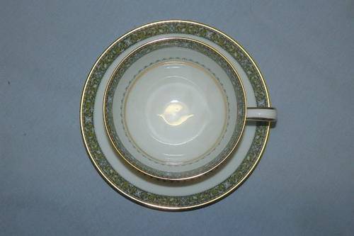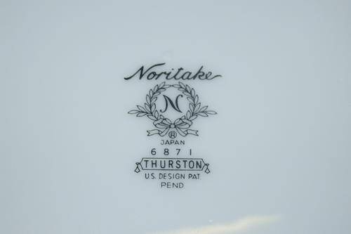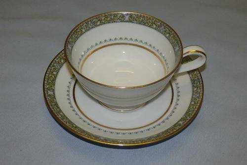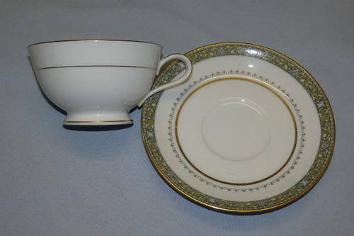 THIS INCREDIBLE SET OF SIX NORITAKE OF JAPAN “THURSTON" PATTERN (6871) BONE CHINA CUPS AND SAUCERS ARE IN EXCELLENT CONDITION. THE THURSTON PATTERN IS A WHITE CHINA WITH BLACK SCROLLS IN A GREEN BAND AND EXQUISITELY FINISHED WITH GOLD GILDED EDGES. THERE IS ABSOLUTE MINIMAL AGE AND USAGE RELATED WEAR AND TEAR AND TARNISHING ON THE GILDING AND THERE ARE NO VISIBLE CHIPS OR CRACKS IN ANY OF THE PIECES. THE THURSTON PATTERN WAS MANUFACTURED BETWEEN 1967 AND 1976.