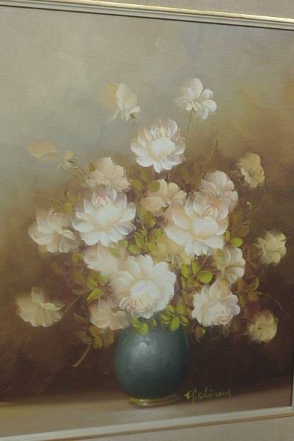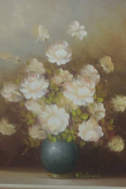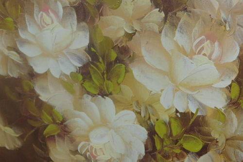 THIS STUNNING SIGNED "FRAMED" OIL ON BOARD PAINTING OF A BEAUTIFUL BUNCH OF WHITE ROSES MEASURES 550mm WIDE x 650mm HIGH. THE PAINTING HAS BEEN DONE WITH A COMBINATION OF A PAINT BRUSH AND A PALETTE KNIFE TO GIVE IT DEPTH. THE PAINTING IS SIGNED BY R. STEVEN. THERE ARE A COUPLE OF SCUFFS ON THE FRAME, BUT NOTHING A LITTLE TLC CANT SORT OUT.