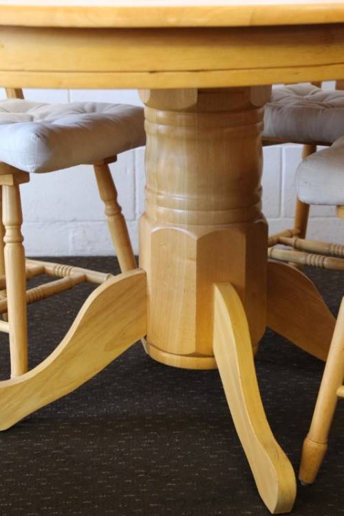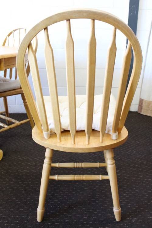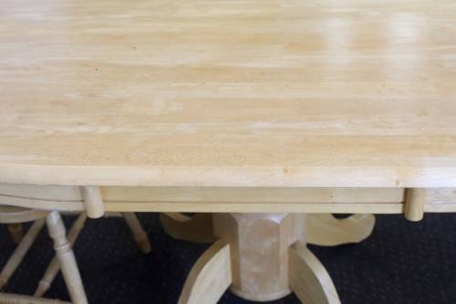 This modern and stylish solid beech wood dining room suite consists of a good size oval dining table and four gorgeous matching Windsor-back beech wood dining chairs with cushions. The table has a substantial centre trunk on four sturdy legs and measures 150cm long x 106cm wide x 76cm high. The four beech wood chairs each measure 45cm long x 48cm wide x 92cm high. The table is big enough to accommodate 6 chairs and one could get two nice carver chairs for the suite. There is minimal and and usage related wear and tear and scuffs etc, and this wonderful dining suite would look amazing in a more modern apartment or covered patio etc. Please view the pics carefully to fully appreciate the awesome solid beech wood dining room suite and to confirm the condition.